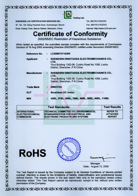 首頁->產(chǎn)品認證->無刷電機RoHS認證證書